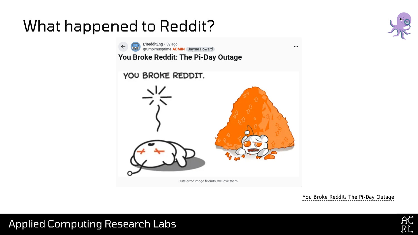 On Pi Day three years ago, March 14, 2023, Reddit suffered a 100-pi-minute long outage, a 314-minute outage. In the extremely detailed and well-written postmortem, it was revealed that one of the primary causes of this outage was a Kubernetes version upgrade from Kubernetes 1.23 to 1.24. Specifically, in this upgrade, Kubernetes changed one of the labels that was applied to its control plane nodes, and Calico, the service mesh component used by Reddit at the time, was using a label selector that pointed to the old label for the node instead of the new label. This caused Reddit to go hard down for around 5 hours.