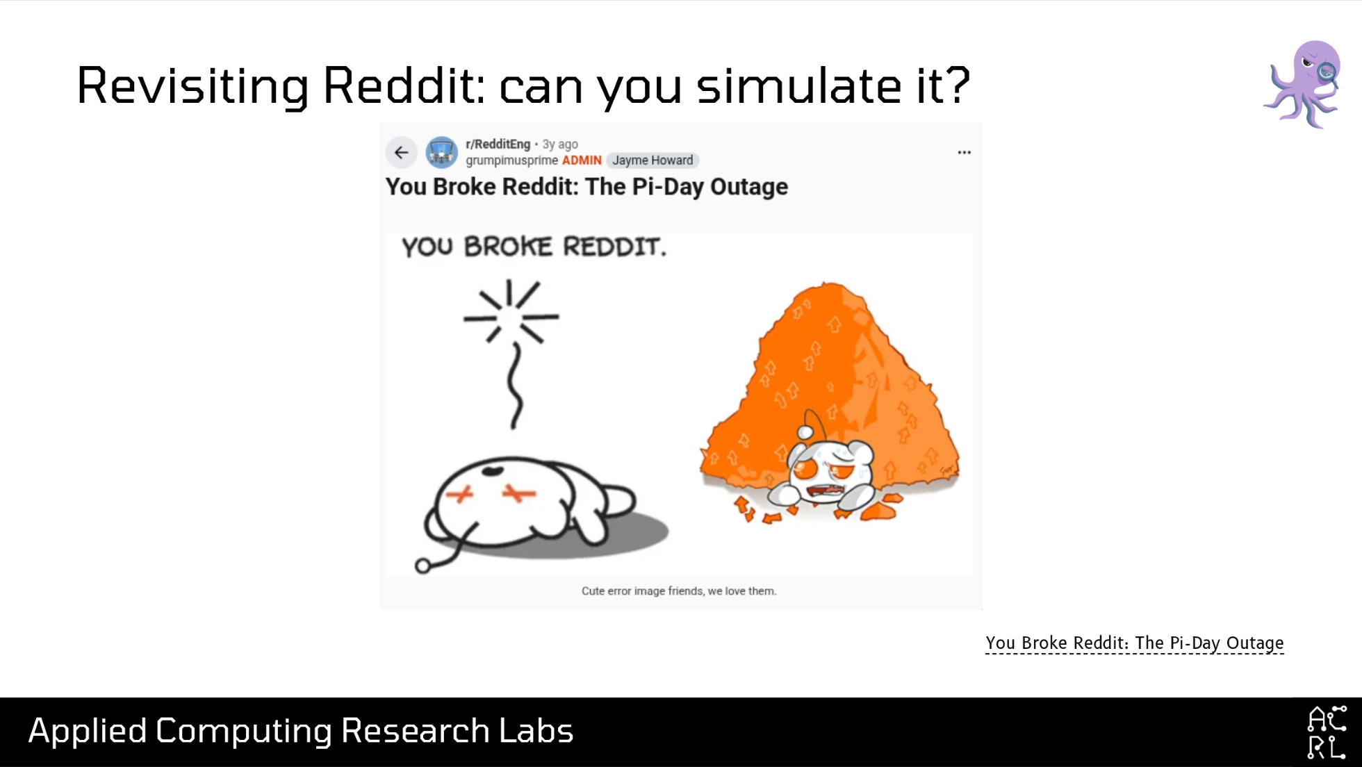 Now: I was not a Reddit engineer at the time of this outage and I am not a Reddit engineer now. In fact, I have never been a Reddit engineer, and I also know for certain that there are Reddit engineers in the audience today who were employed at Reddit at the time this incident happened. So let’s take a detour to answer the question, “Who the heck am I and what am I doing here?”