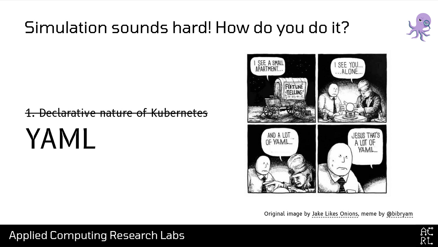 I think there are a number of reasons, but a significant one is: distributed systems are already hard. And simulating them is even harder. However, in the case of Kubernetes, I think there are two things going for us: the first is the declarative nature of the system. It’s a well-known design goal of Kubernetes that you write down the desired state of the system, and the Kubernetes control loops will try to move the observed, actual state of the world to that desired state. In other words: YAML. I know we all love to hate YAML, but for the purposes of simulation, I think it’s really beneficial. We can track, in a simple, easy-for-humans-and-computers-to-read format, the changes in the desired state of the system over time. And then we can record all of those changes into a trace file, which we can then replay in our simulated environment as many times as we want! Nifty.