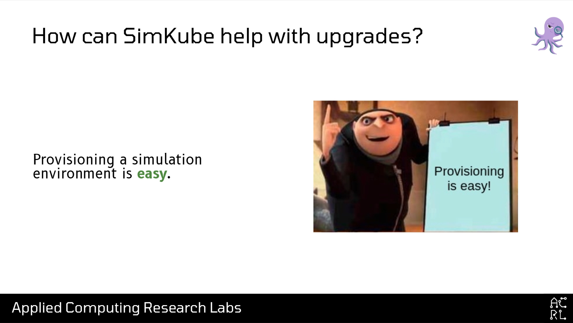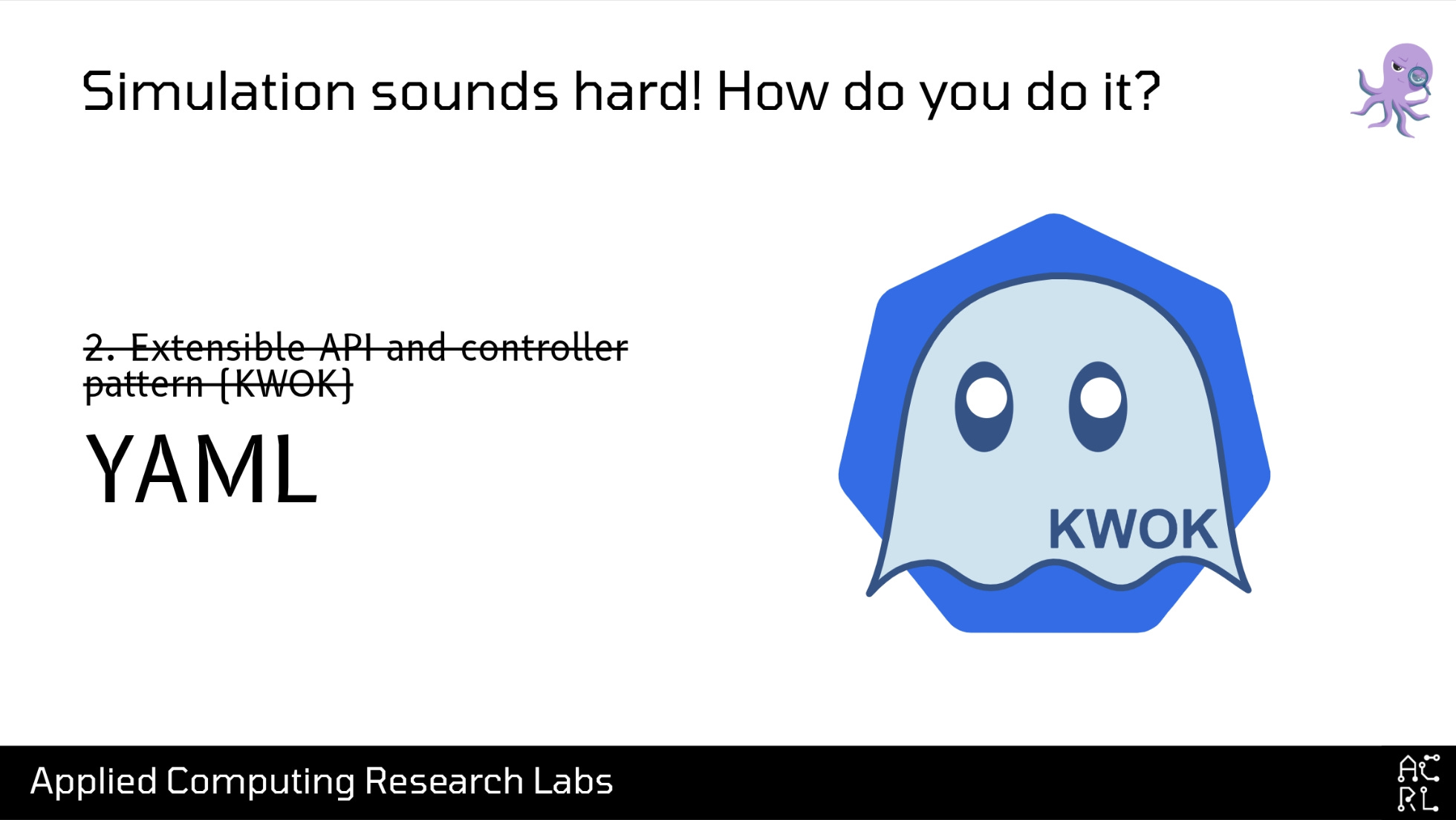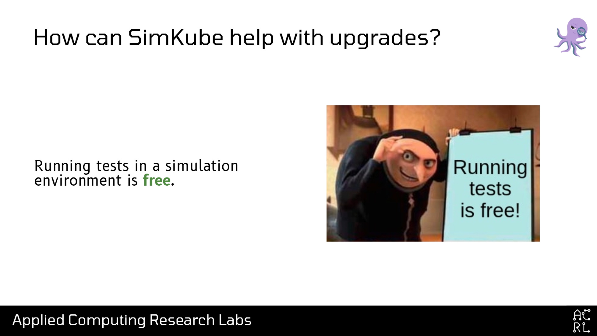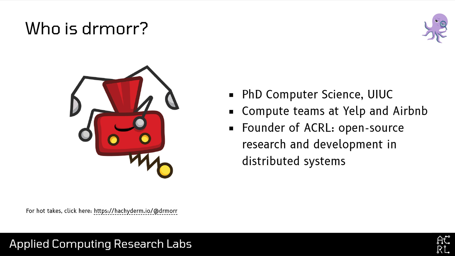 Hi! My name’s David; I go by drmorr on the internet, and I use this cute little grumpy red robot icon basically everywhere. I received my PhD in Computer Science from the University of Illinois in 2014, where I was focused on scheduling and optimization problems. From there, I got my first introduction to distributed systems at Yelp, which at the time was unhappy with the amount of money they were paying to AWS, and asked me to use my optimization skills to help them pay less money to AWS. Of particular note for this talk, while I was at Yelp I wrote my first distributed systems simulator, a simulation engine for Apache Mesos that we used to try to understand some of the cost-reduction changes we wanted to make. From Yelp I went to Airbnb, doing more of the same: scheduling, autoscaling, and cost optimization, before finally starting ACRL—a small business focused on open-source research and development in distributed systems. One of ACRL’s primary projects is a simulation environment for Kubernetes called SimKube.