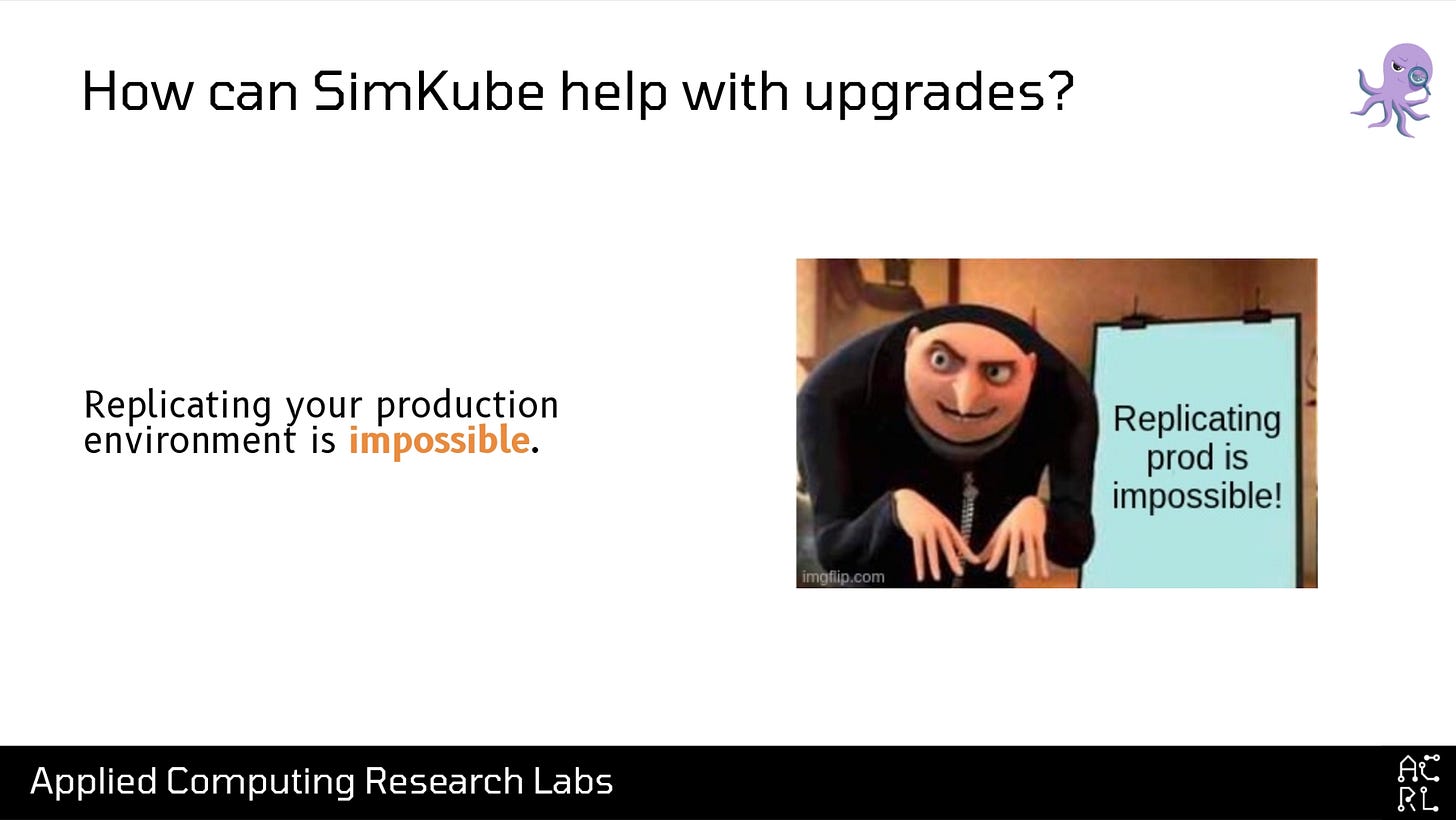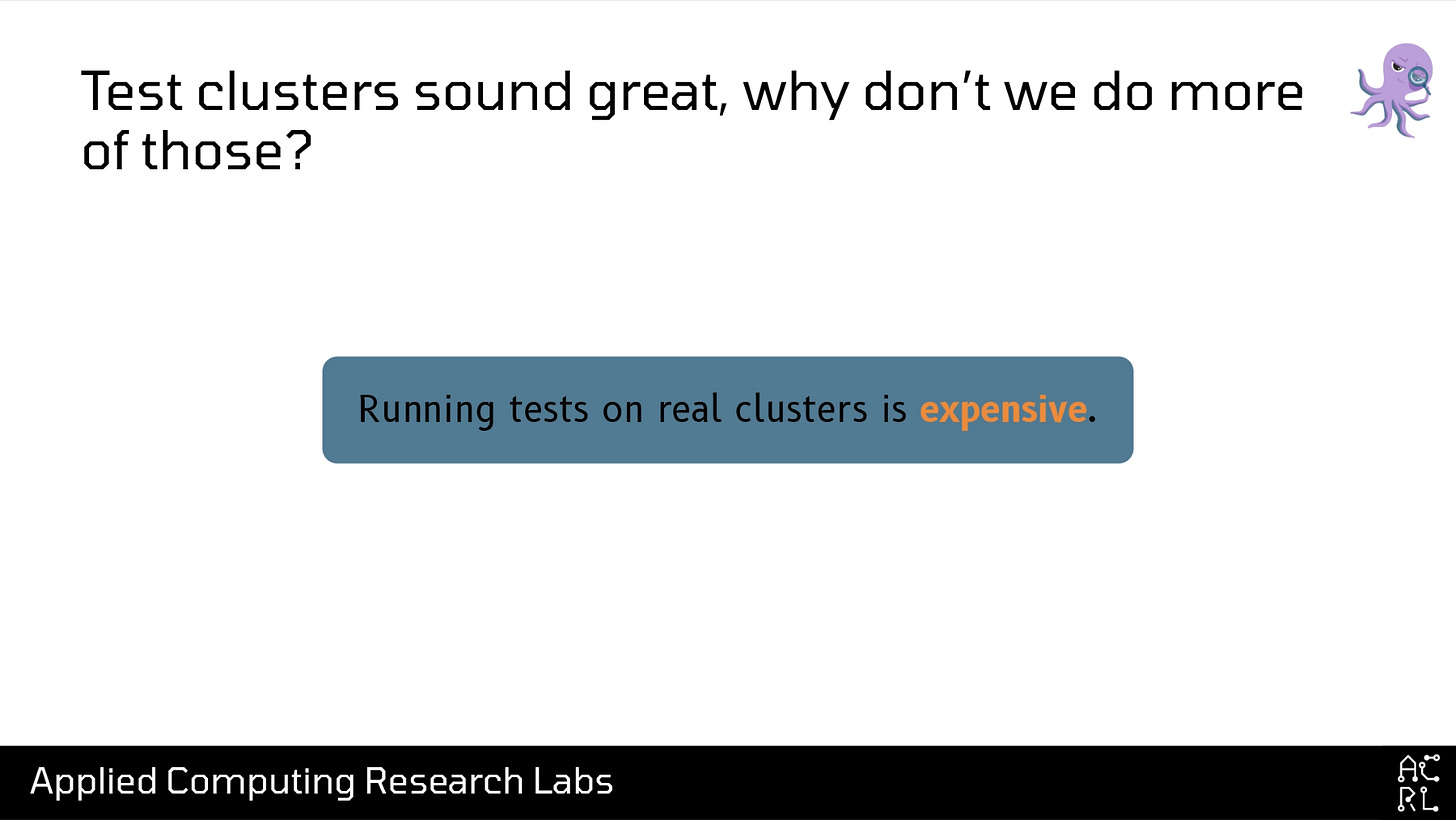 The second reason why test clusters aren’t as effective as they could be is that they’re expensive. Particularly if you’re doing any sort of scale or load testing (and you want to do scale testing, because this is where the most gnarly and hard-to-detect issues live), it’s going to cost a lot of money. If you go to your boss and say, “Sure, I’ll happily do this upgrade, I just need a million dollars to run a thousand-node test cluster for a month,” they’re going to come back with, “No, try again.”