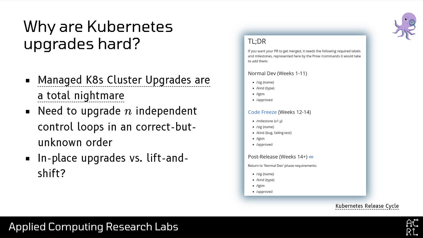 With that out of the way, let’s go back to the topic at hand: why are Kubernetes upgrades so challenging? In the screenshot on the right, you can see the Kubernetes release schedule, and the main takeaway from this is that a new Kubernetes version is released every fourteen weeks—that’s three new versions a year. This is an extremely aggressive release cycle, and one that is difficult to keep up with. It’s easy to find many links on the Internet like this one, entitled “Managed Kubernetes Cluster Upgrades are a Total Nightmare”. What makes them so hard? Well, the primary reason is that upgrading Kubernetes requires performing upgrades to n independent control loops in a correct-but-unknown order. Threads like the above are filled with debates about whether you should do this process “in-place” or via a “lift-and-shift” approach where you spin up a cluster on the new version and then migrate your workloads over: and to be honest, both approaches have their tradeoffs.