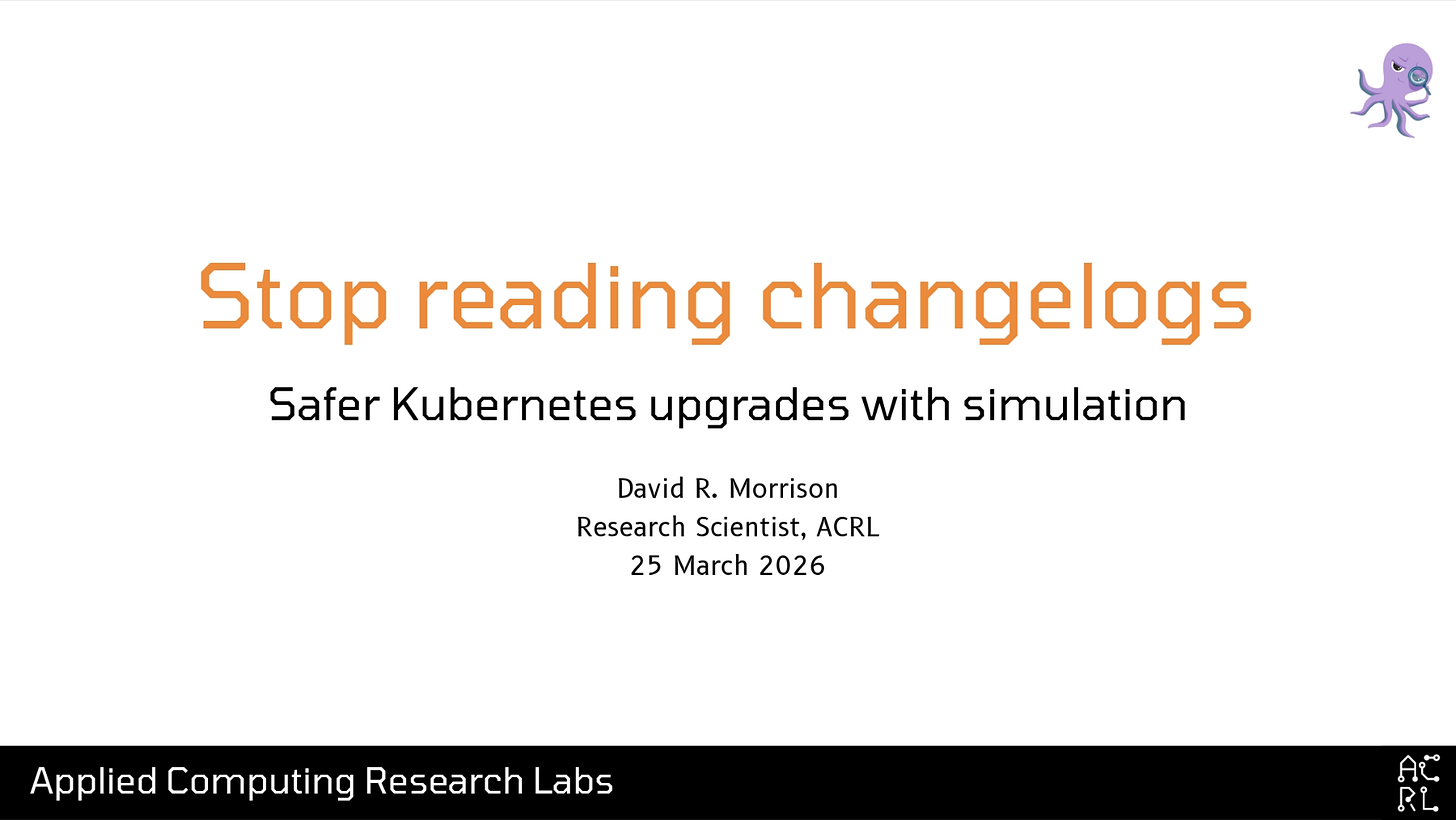 Thanks all for coming; the title of my talk today is “Stop Reading Changelogs: Safer Kubernetes Upgrades with Simulation”.