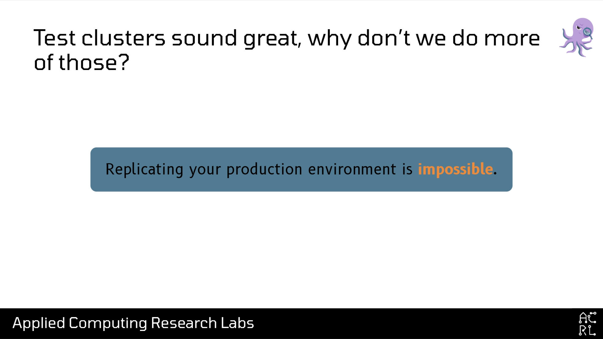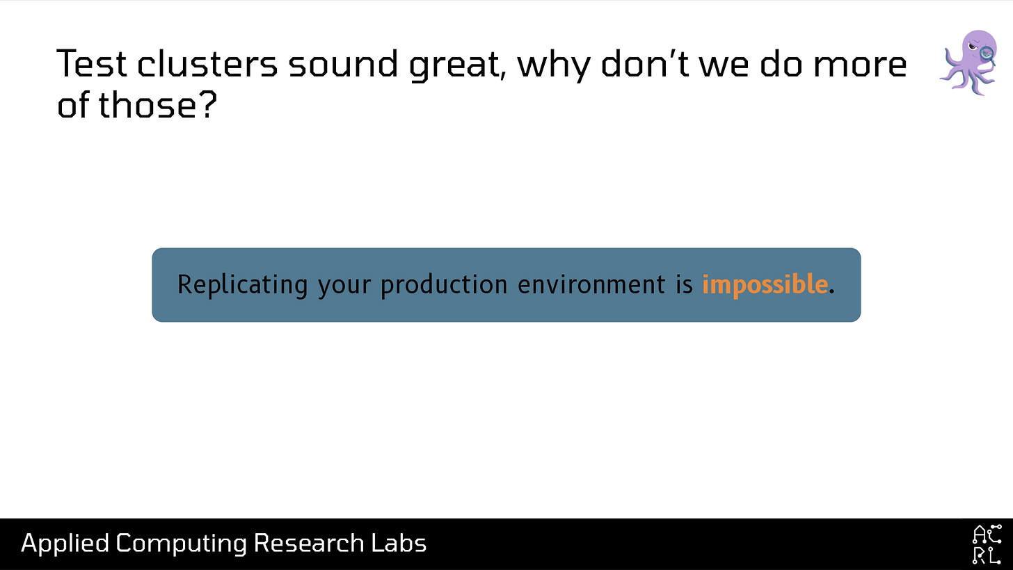And the last reason why test clusters are hard is that replicating production is impossible. See, production has a bunch of annoying things like “users” and “network traffic” that you just don’t have even in a full-fledged staging or test environment. And you’re never going to be able to replicate and test all of that stuff.