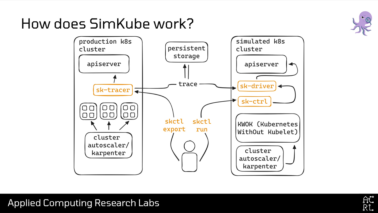 So with that, we can finally talk about how SimKube works. This next slide is a high-level architecture diagram of SimKube: I don’t care if you understand the details, all I want you to take away from this is that on the left, we have our real, production Kubernetes cluster. Inside that cluster, we have a small agent running that’s tracking all of the changes made to the YAML files describing that cluster; at any point in time, a user can then export those changes into a trace file, which get written to some persistent storage, and then replayed in the simulation environment on the right.