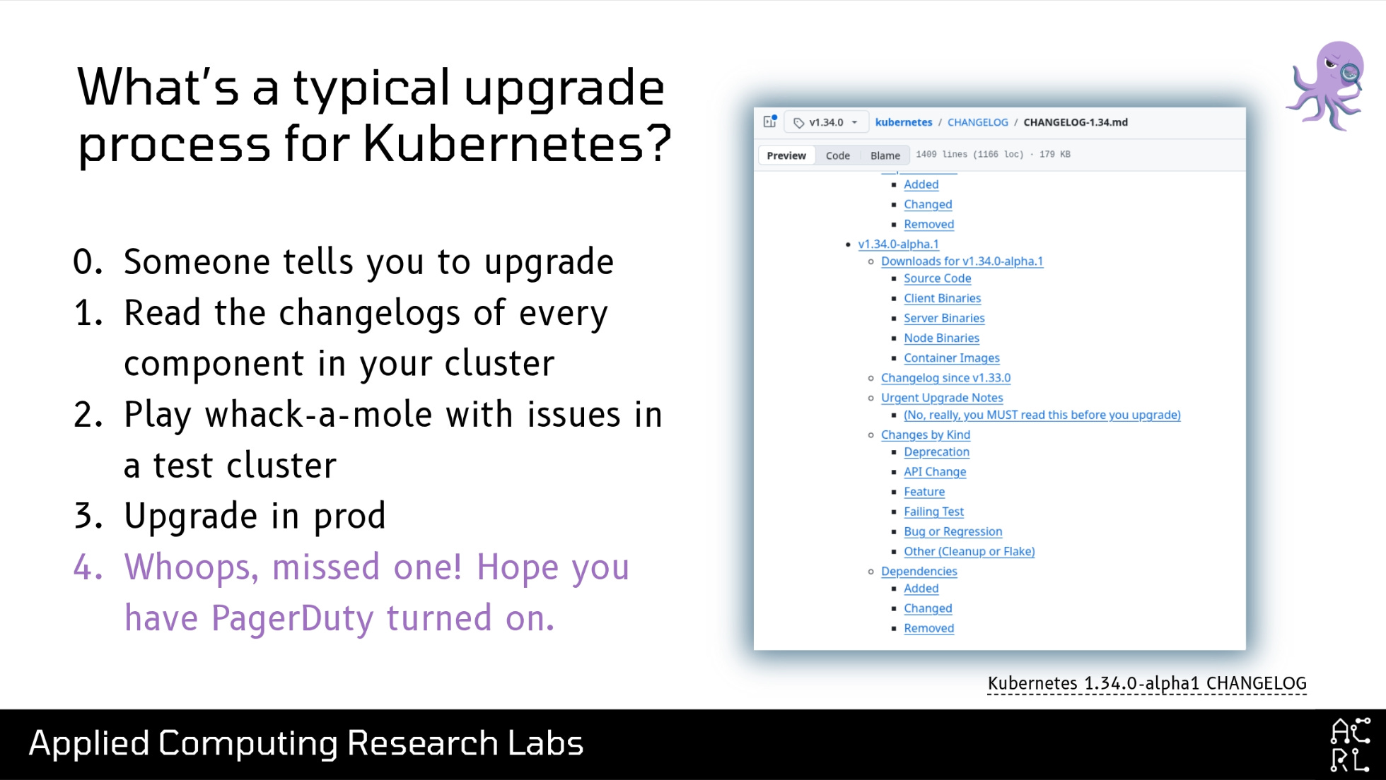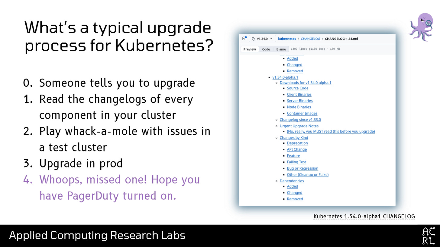 So once you’ve decided to do the upgrade, you might decide that the reasonable next step is to read the changelog. On the right of this slide is an example for the Kubernetes 1.34 changelog. The text is probably too small for you to read in the back, but buried in the middle of this 2000-line-long markdown file are two bullets: the first reads “Urgent Upgrade Notes”, and the second sub-bullet says, in parentheses, “(No, really, you MUST read this before you upgrade)”. Again, this is in the middle of a multiple-thousand-line markdown file that users are expected to read.