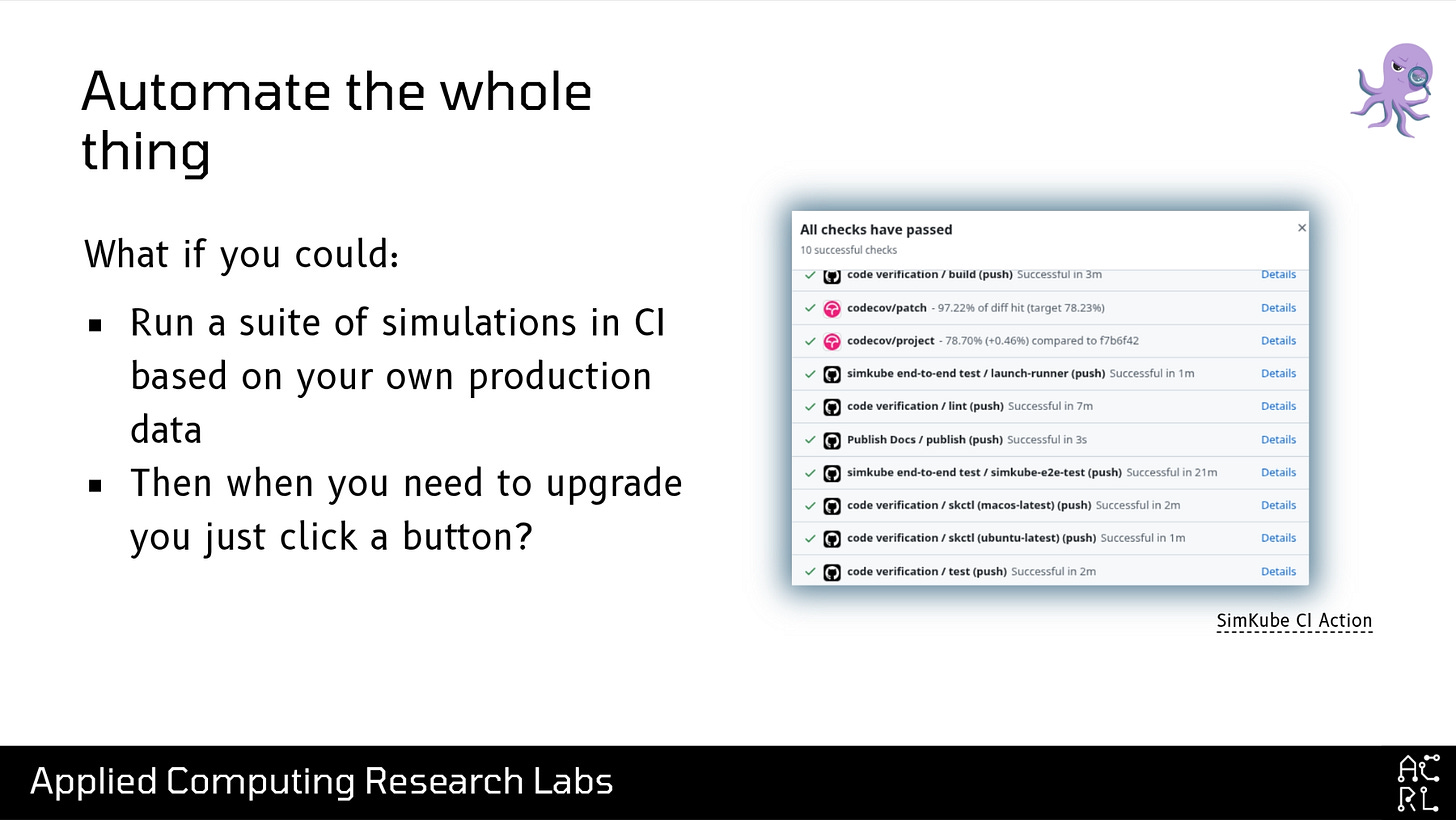 So that’s SimKube, testing your Kubernetes upgrades! We can go even further, though: we’re all SREs, we like to automate things, so what if we just automate the entire process? Imagine if you regularly collect some traces from your production infra, store them in S3, and then periodically—maybe every time you need to upgrade, or maybe even just once a month to establish a baseline—you run those traces through a simulator, maybe as a CI job or something else? Well, it turns out you can do that too. We’ve released a free AMI that you can use to play around with SimKube, and soon we’ll have a GitHub runner that you can plug into your CI pipeline as well. In fact, we do exactly this on the SimKube repo: on the right you can see a screenshot of our GitHub actions, and on every merge to main we run an end-to-end test of SimKube on a few sample traces to ensure that the system is behaving properly.