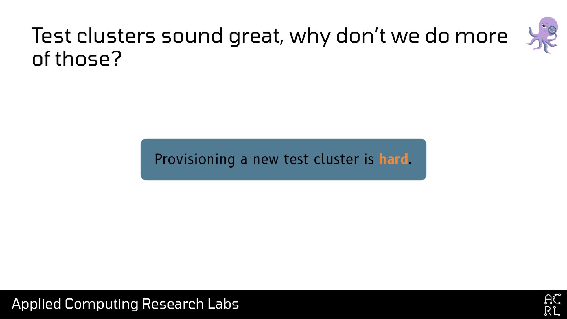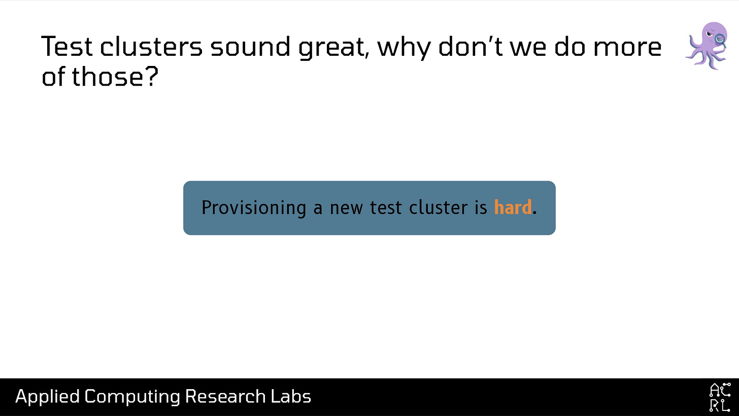 However, there’s one point in this upgrade process that seems promising, and that’s this test cluster idea. Test clusters seem great! Why don’t we do more of those? In my experience, there’re three reasons why: first is that provisioning a new cluster is hard. I’ve been at some organizations where you can push a button and get a new cluster in about 30 minutes. I’ve been at other organizations where you have to make 10 changes in 20 different repos, and if you’re lucky you might have a running cluster 3 weeks later. I’m sure many organizations fall somewhere on that spectrum. But in any case, even waiting 30 minutes for a new cluster introduces a lot of friction when you have to repeatedly spin up and tear down an environment while you test things out.