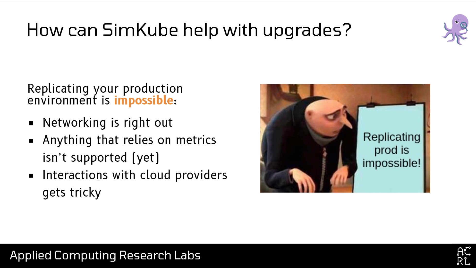 Ok, look. I don’t want you to walk out of this talk thinking that simulation is a silver bullet. The whole entire point of simulation is that you’re throwing out some part of your system in the hopes that it makes the analysis of the other part easier. The trick is knowing what part of the system you want to throw out while still maintaining the right level of fidelity. So here are three examples of places where SimKube struggles.